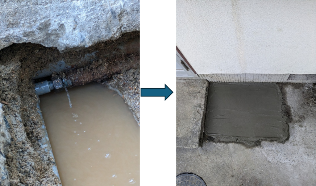 漏水箇所を修繕し、はつった部分は新しいセメントを練って整えて完了です。