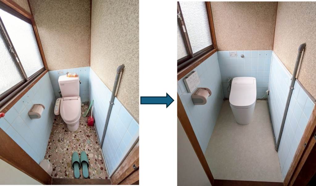 児島の下の町にてトイレのリフォーム工事をしました。陶器の便器からアラウーノへ取り替え、
